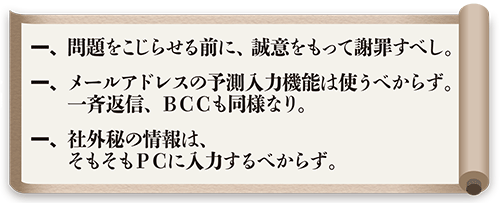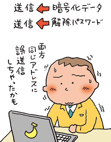 そもそも「社外に出せない情報はPCに入力しない」といったルールを導入するのも一つの対策法だ。そのうえで「送信先のアドレスの再確認を促すアドオン(機能追加)ソフトを、PCにインストールするのも手です」(山口氏)。重要なデータを送信するときは、データを暗号化してパスワードで開くように設定し、パスワードは別メールで通知するといいだろう。