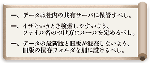 「ファイル名のつけ方といったデータの標準化ルールも決めておけば、イザというとき、すぐに検索できます」と、中村氏は説明する。