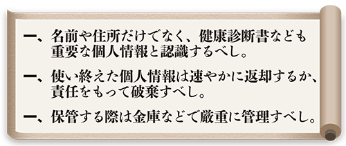 健康診断データは、チェックしたら、原則としてすぐに下請け会社に返却しなければならない。しばらく手元に置きたいのなら、下請け会社(作業員)の同意を得た上で、金庫などに入れて厳重に保管すべきだ。