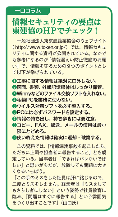 社員教育のテキストとしては、前号に掲載した「情報セキュリティ・レベル診断シート」のほか、東京建設業協会の「情報漏えい防止徹底のお願い」(コラム参照)も活用できるので、参考にしてみよう。