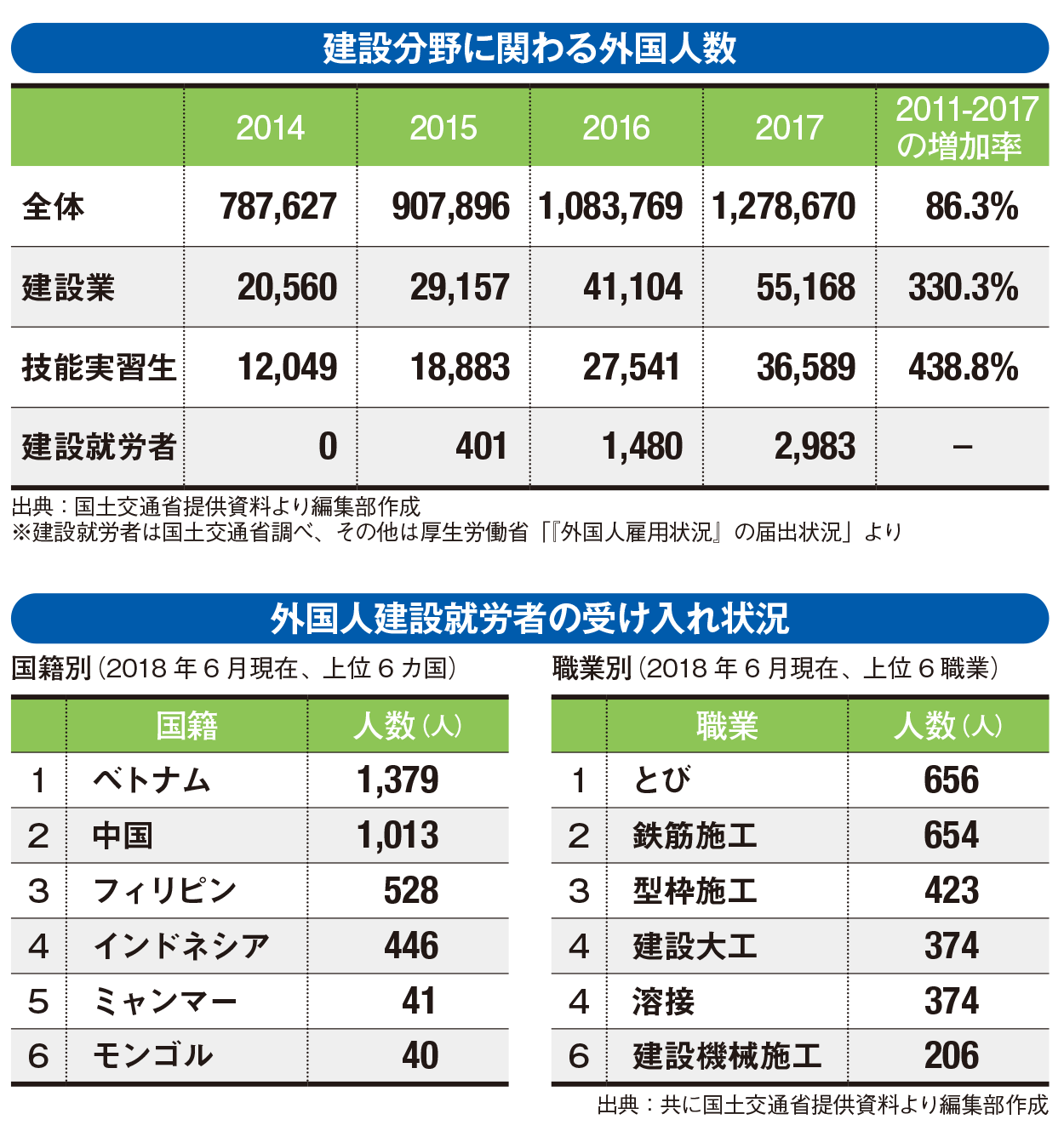 実際に建設業での外国人材の受け入れは、急激に増加している。年には約1万3000人だったが、年には約5万5000人と、6年間で330.3%の伸びを記録した。全産業の平均伸び率が同・3%であることから建設業の人手不足の深刻さがうかがえる。