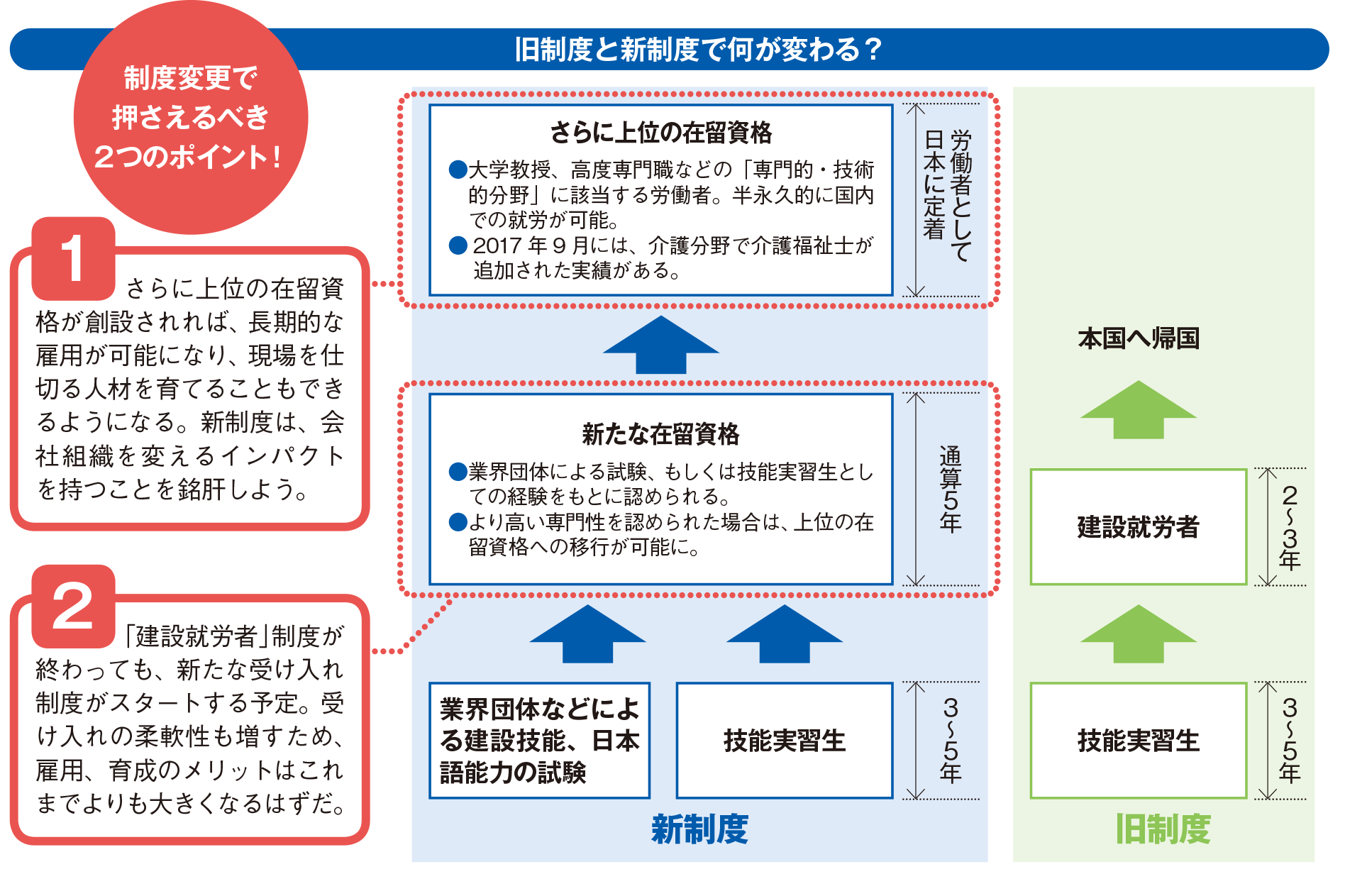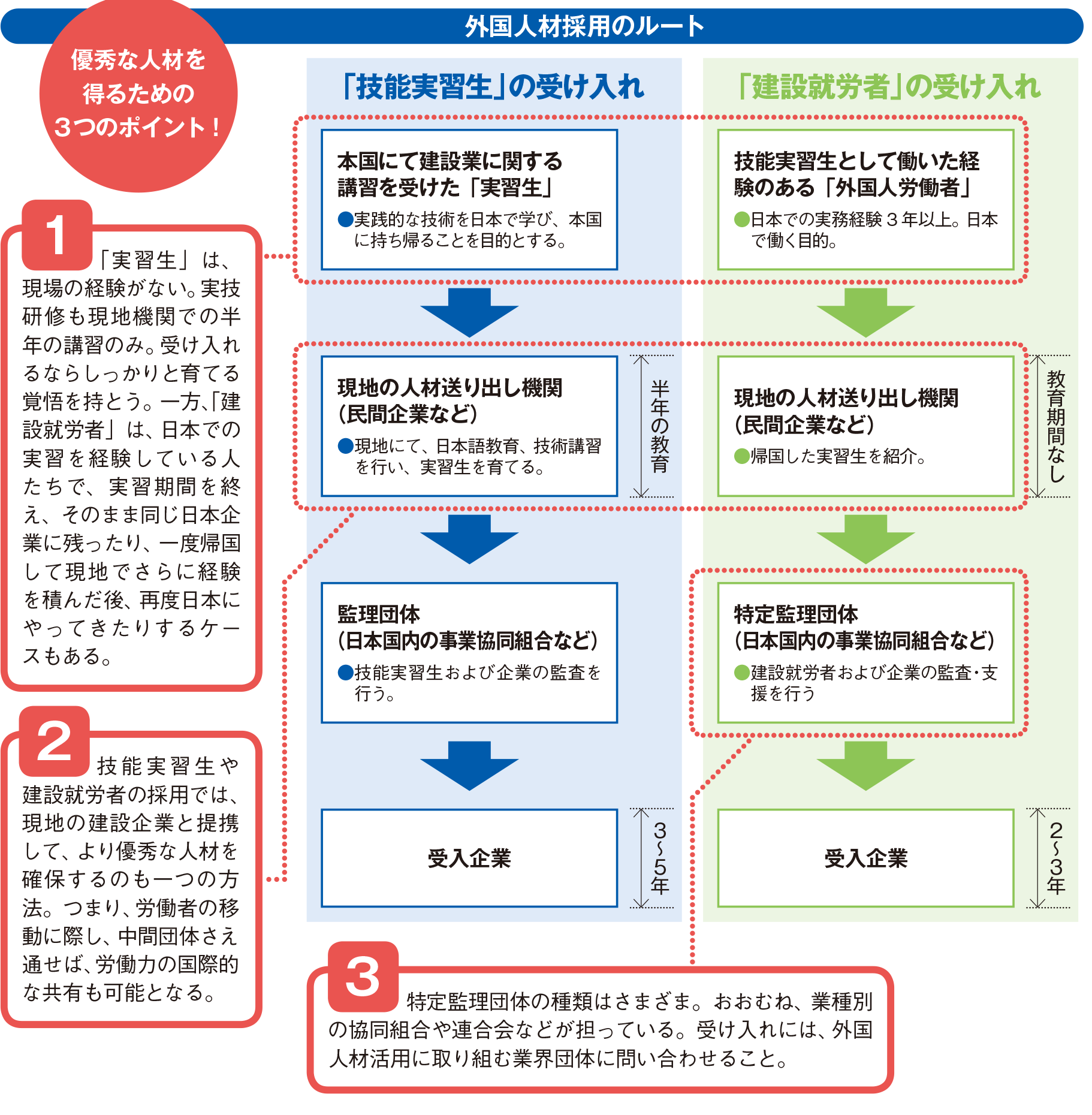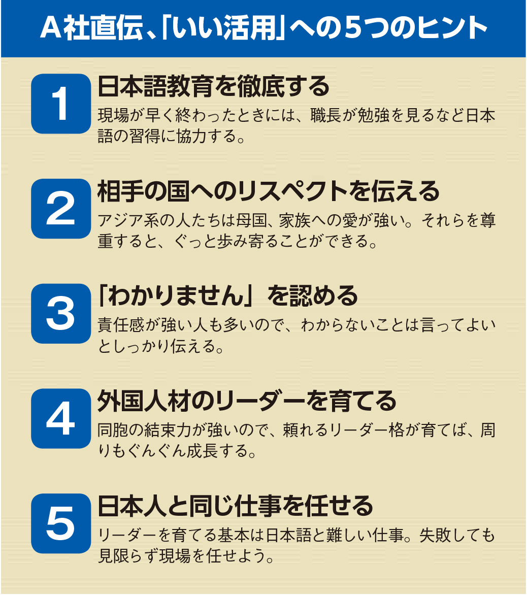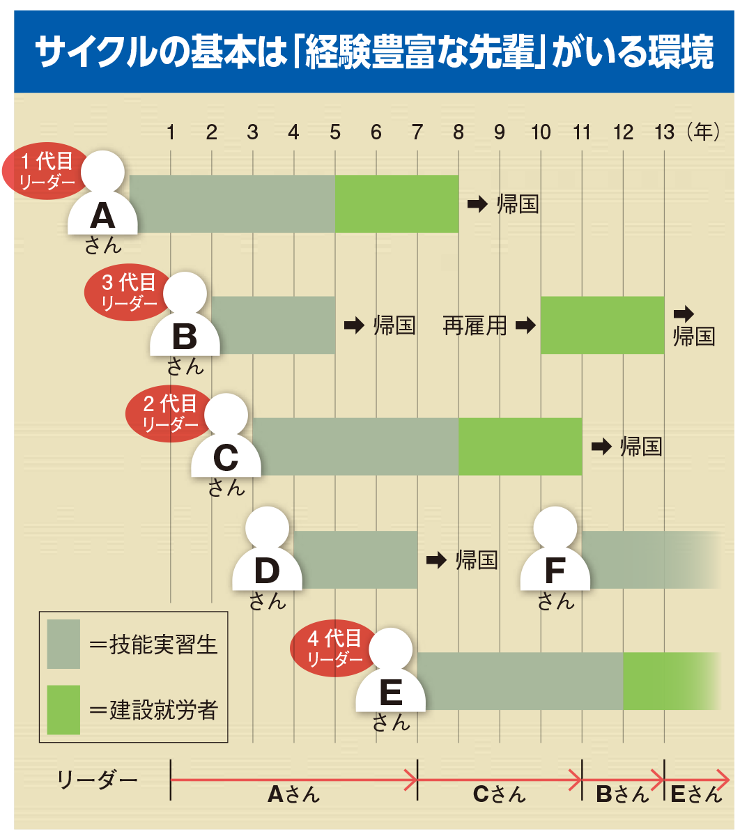 A社の話でいえば、「“実習生からいる建設就労者”は、2年で日本人の3年目、3年で4、5年目レベルになる」という。現状でも最長で年の就労が可能なため、外国人材全員の面倒を見る兄貴分的な「外国人材のリーダー」を育て、その役目を外国人材間で引き継ぐことができるようにすれば、職人不足に悩むことはないということだ。