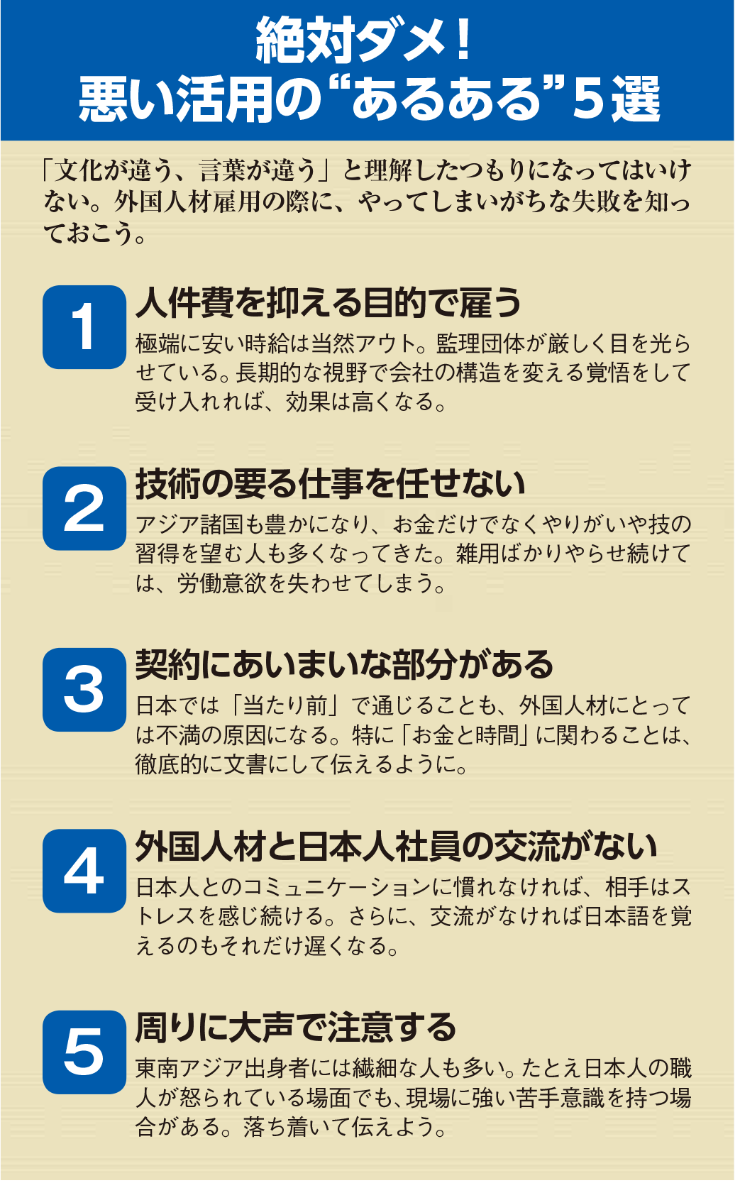 特に給与面の条件は細かく伝えるようにすべきだ「。家からの移動時間は時給が発生しない」「始業時間より前に出社する」「雨で現場が流れたときは、別の日に振り替える」など、日本では働き方の不文律となっていて、あえて確認しない事柄も、外国人材からみれば「聞いてない」と不満の対象になりやすい。