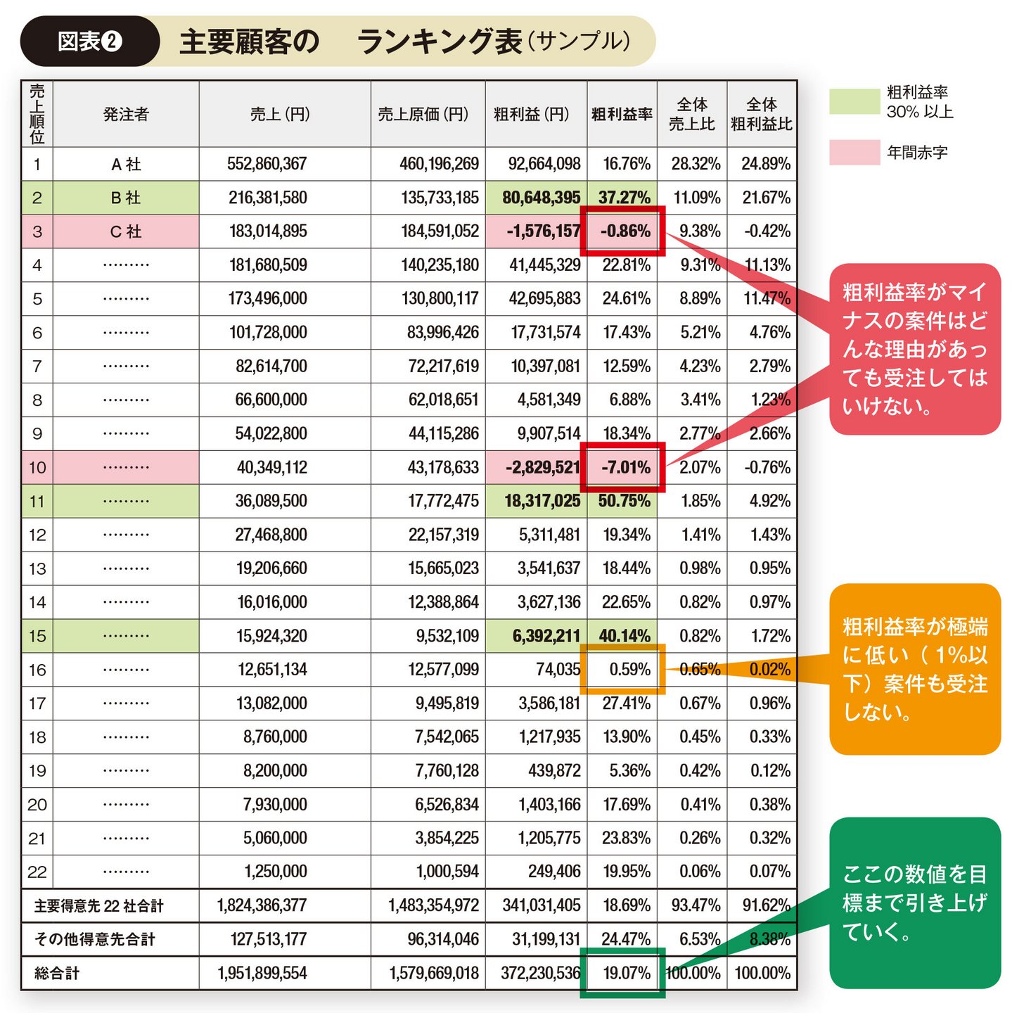 経営状況を把握するためには、過去3年分の採算データをチェックするのが効果的だ。完成物件の数字を1件ずつチェックし、取引先別、売上規模別などで分析する(図表❷参照)。