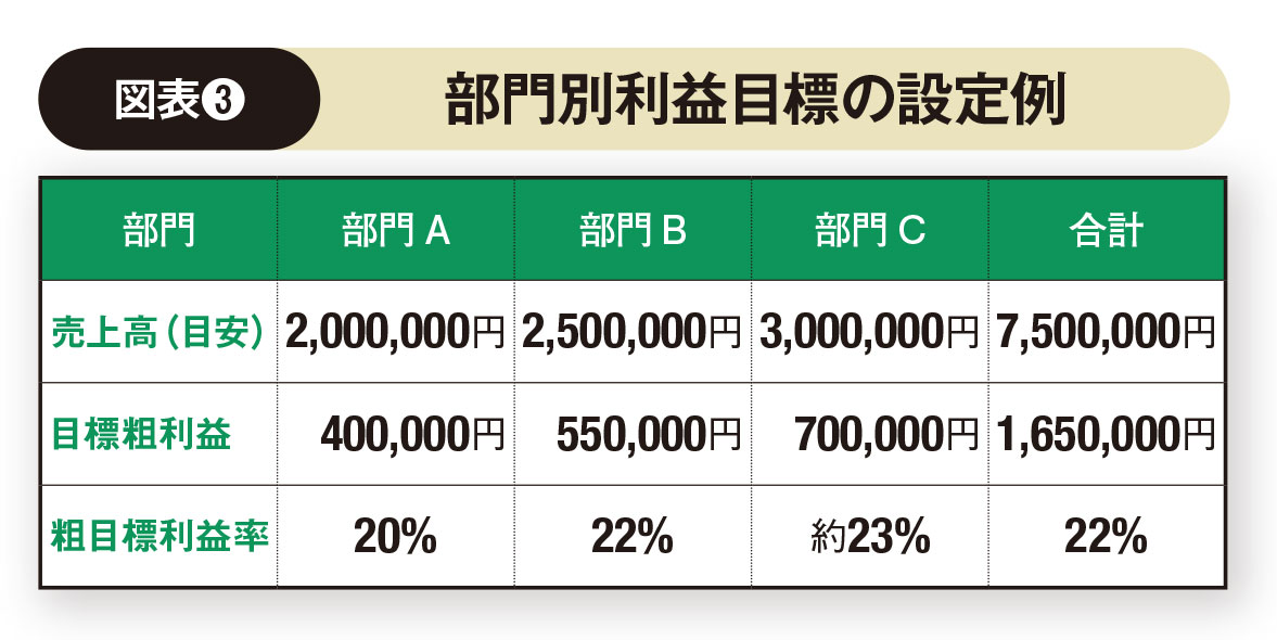 ステップ2では必要粗利益額を計算する。前期決算の「一般管理費」に借入金の「支払い利息」「元金返済」を加え、社員のボーナスなど「社員待遇改善費」、一定の設備投資や予備費などをれが会社を健全に運営していくために最低限必要な粗利益となる。この金額を全社員が一丸となって確保する気持ちにならなくてはならない。