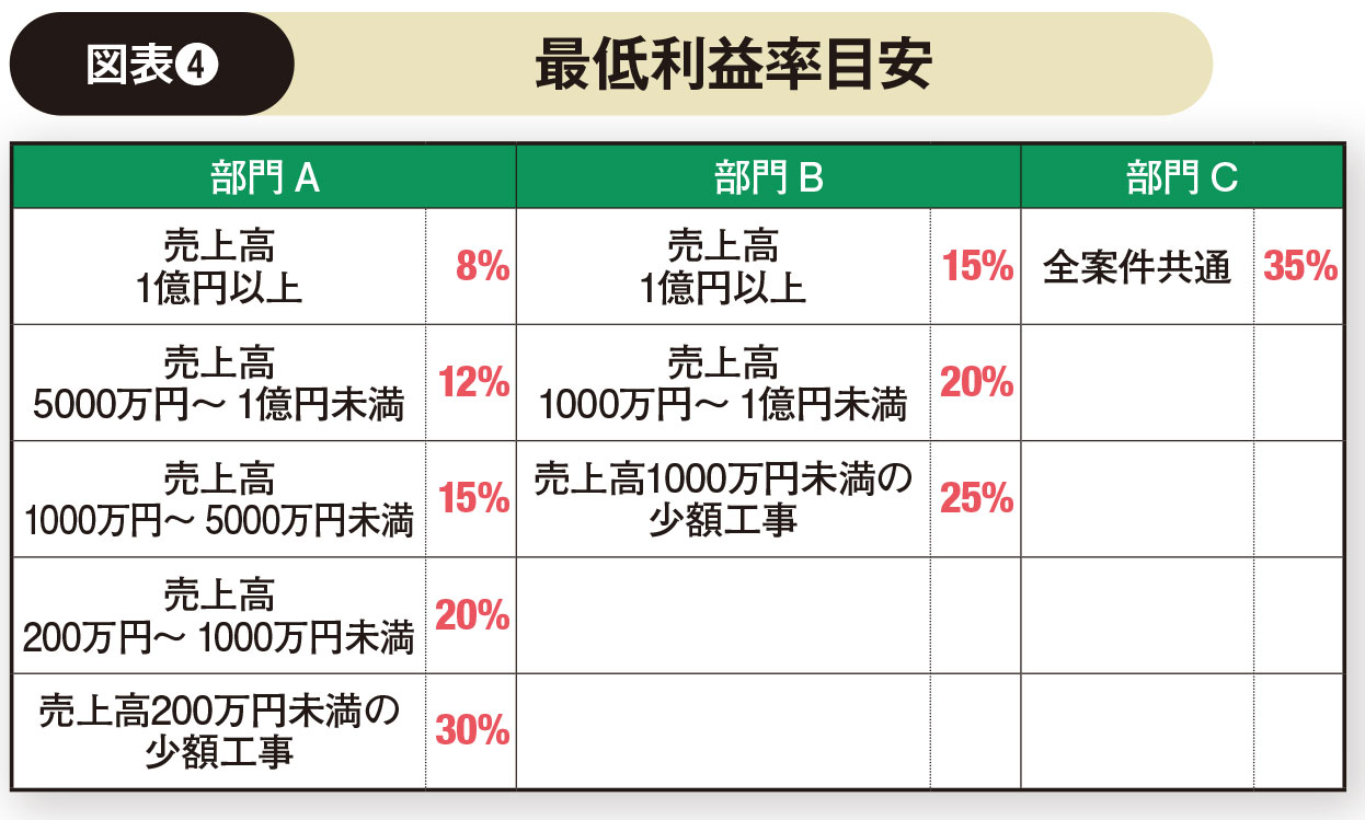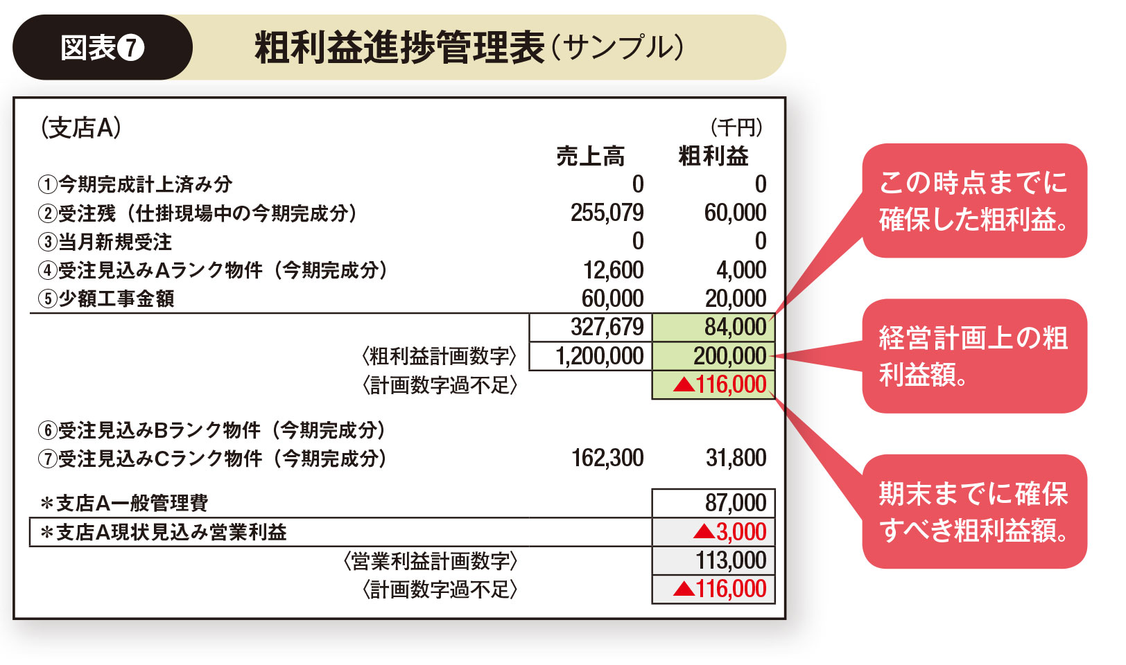 必要粗利益額を黒字にするには、利益幅の狭い案件を受注しないとともに、「予算先行管理」を徹底する必要がある。全社の必要粗利益額を各部門、各支店に割り振り、利益額の進捗状況を月ごとにチェックする。遅れがあればその時点で手を打つ。「売上最優先でとにかく受注を目指し、工事が終わってみなければ利益額がわからないのとは正反対の方法です」