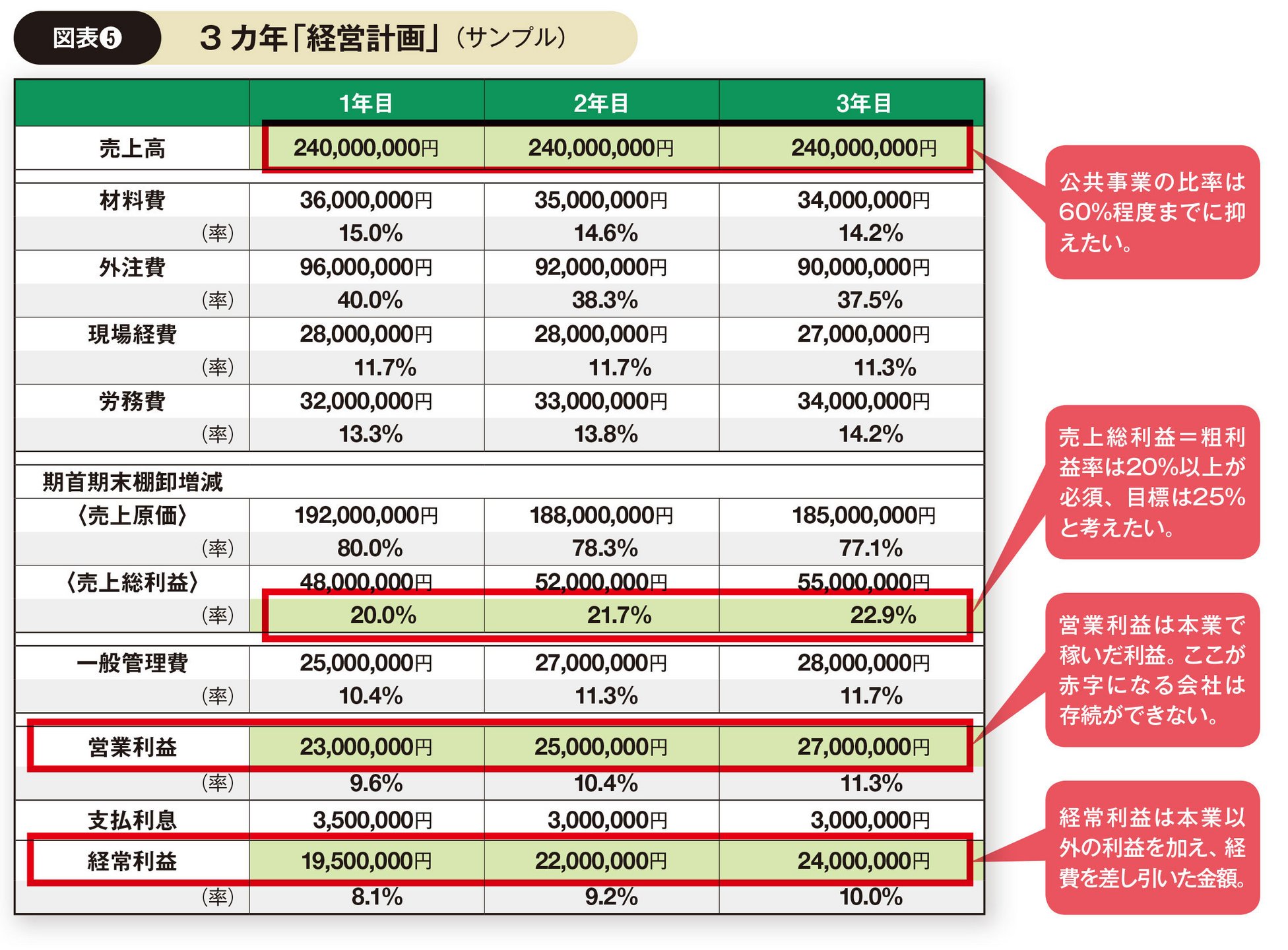 必要粗利益額を継続的に確保していくためには、「経営計画」と「営業戦略」が欠かせない。まずは、必要粗利益額を数字に落とし込んだ向こう3年間の経営計画をつくる。これは会社が目標を達成するための設計図となる(図表❺参照)。