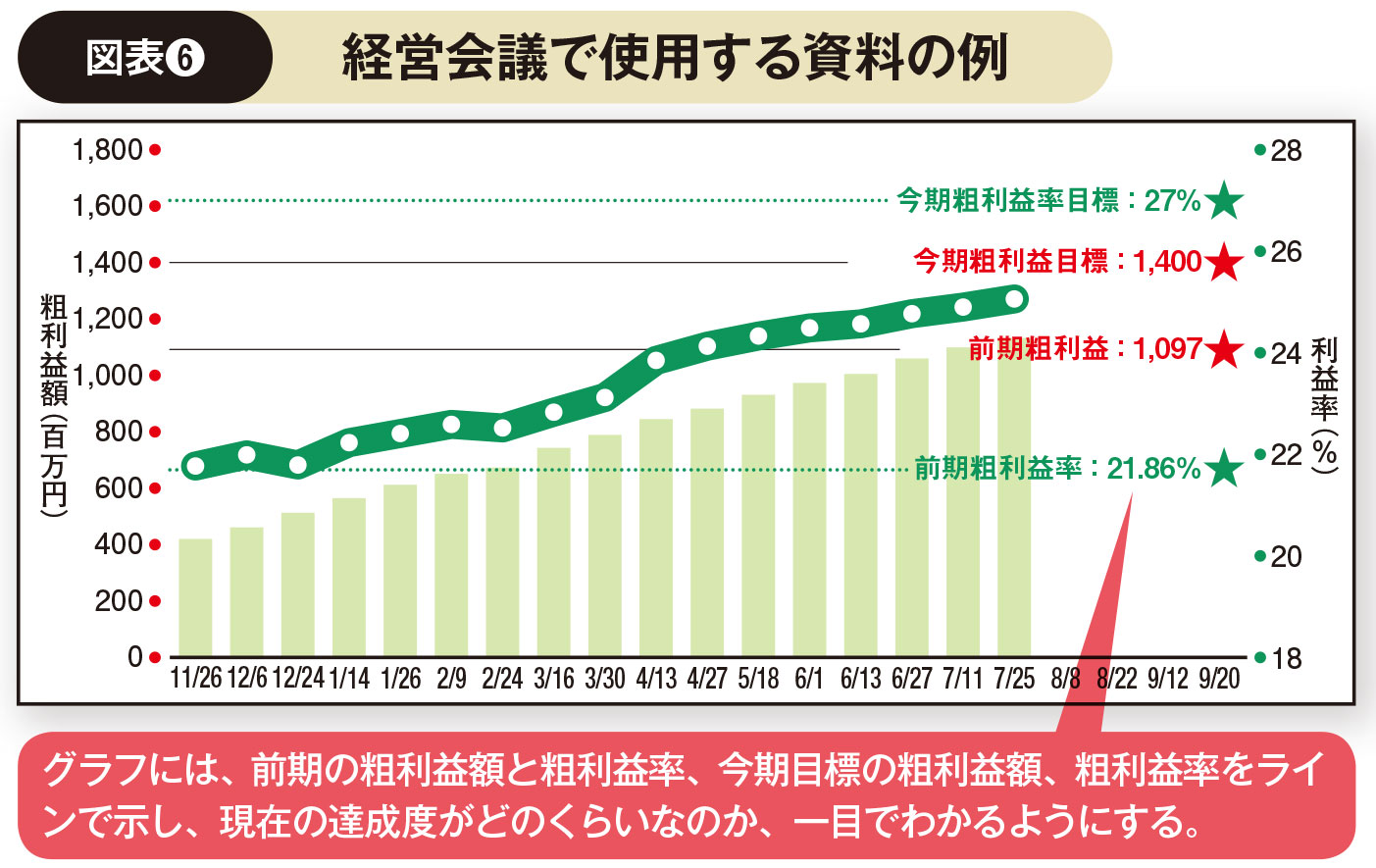 ここまでできれば、あとは目標に向かって進むだけだ。定例会議を設定して、粗利益の進捗状況などを確認していく(図表❼参照)。建設業の場合、工期が少なくとも3カ月程度はかかる。期の折り返し時点(決算の6カ月経過時点)で、目標受注額の70%程度は確保しておかないと、期末で数字が届かないので、進捗管理は重要となる。