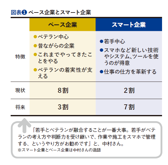 「現在、地域建設企業は『ベース企業』と『スマート企業』の2つに分類されます。ベース企業とは、ベテラン中心の昔ながらの企業で、スマート企業とは、若手中心で新しい技術を使って仕事の仕方を革新する企業です」(図表❶参照)