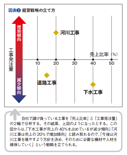 このデータから、「将来性のある河川工事の割合を増やしたほうがより高い収益を上げられる」と予想できるので、その方向で目標を立てる。このように工事発注量と売上比率の表を作成して分析し、社員全員で共有、認識することが重要なのだ(図表❷参照)。
