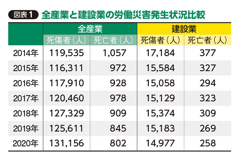 実際、ゼネコンの安全対策に対する取り組みは、近年かなり進んでいて、その効果も徐々に表れつつある。図表をご覧いただきたい(図表1参照)。2014年から20年までの労働災害発生状況を、建設業と全産業で比較したものだが、全産業の死傷者数が増加傾向にあるのに対し、建設業は減少傾向にある。また、死亡者数も14年から20年の減少率を比べると、全産業が約24%、建設業では約32%と、全体を上回る率で建設業が減っているのだ。