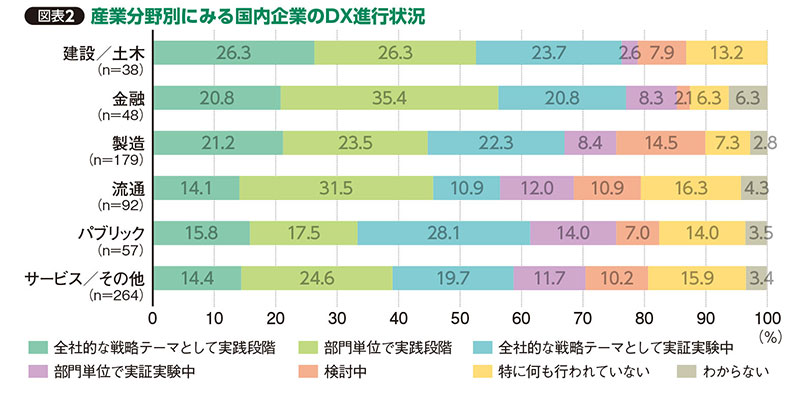 こうした行政サイドの後押しもあって、建設業界のDXは比較的進んでいるほうともいえる。IT専門の民間調査会社であるIDC Japan株式会社が行った調査によると、建設・土木業でDXを全社的なテーマとして取り組んでいるのは26.3%で、金融業や製造業を抑えてトップだった(図表2参照)。