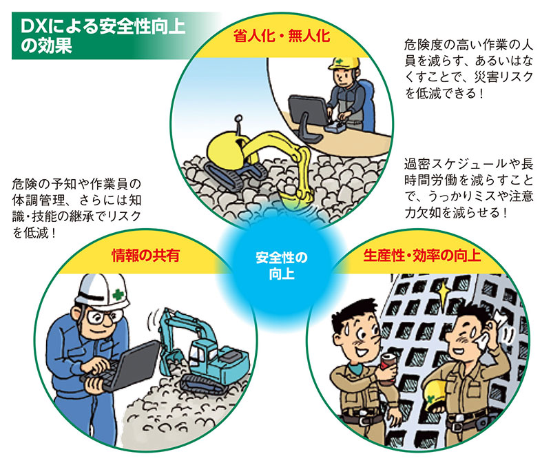 国土交通省は、2016年から「i-Construction(アイ・コンストラクション)」というプロジェクトを推進している。これは、「『ICTの全面的な活用(ICT土工)』等の施策を建設現場に導入することによって、建設生産システム全体の生産性向上を図り、もって魅力ある建設現場を目指す」というものだ。いわば建設DXを加速させるためのきっかけにしようという取り組みで、もちろん建設現場の安全性向上も大きな目標の一つになっている。ICT(情報通信技術)やIOT(モノのインターネット)、さらにはAI(人工知能)を活用し、危険が伴う作業を無人化あるいは省人化して、リスクを極力ゼロに近づけようというわけだ。