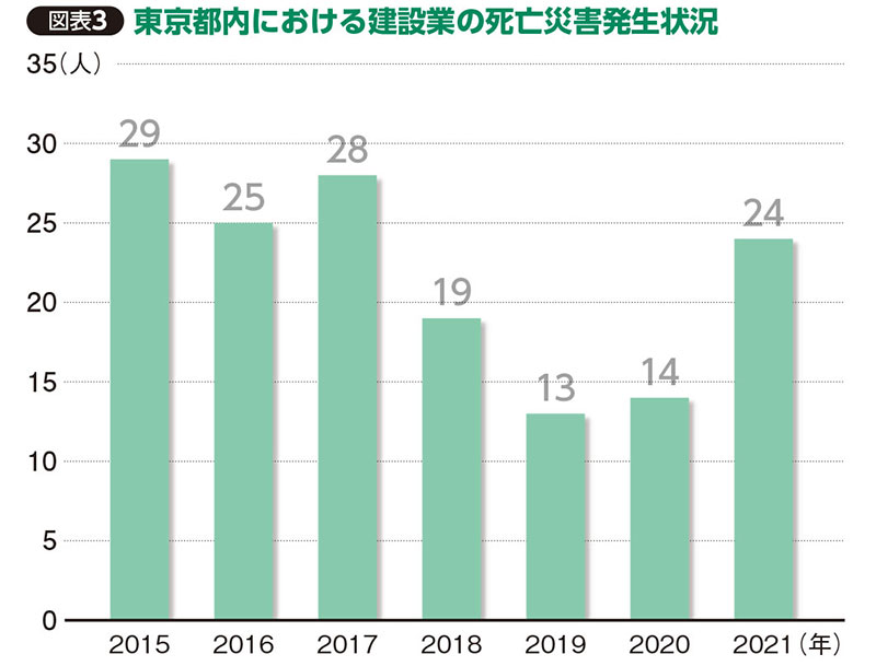 まずは図表をご覧いただきたい(図表3参照)。東京都内における建設業の労働災害での死亡者数を示したものだが、20年までは減少傾向にあったものの、21年に跳ね上がったのがおわかりいただけるだろう。