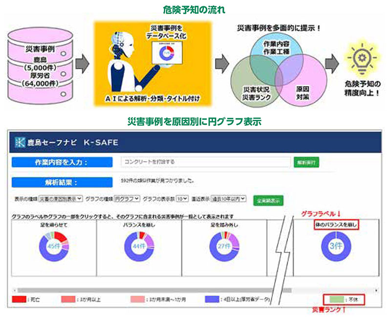 「鹿島セーフナビ」の肝は、AIに取り込まれたデータ量の多さだろう。鹿島建設が独自に保有する約5000件の事例に加え、厚生労働省が運営する「職場のあんぜんサイト」に掲載されているおよそ6万4000件もの事例が取り込まれている。