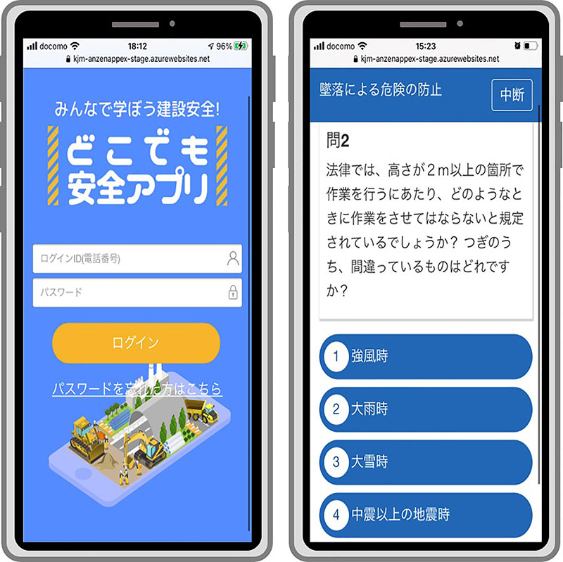 そう語るのは、前出の鹿島建設・嵩氏だ。同社が開発したのは、建設現場の技能労働者向け安全教育アプリ「みんなで学ぼう建設安全! どこでも安全アプリⓇ」である。すでに2021年4月から全国の土木工事現場で運用されているこのアプリは、技能者がスマートフォンで手軽に、安全に作業するための知識を学ぶことができるシステム。QRコードを読み取ってアクセスし、安全に関する問題を選択式で解答するもので、全現場共通の基礎的な100問で構成されている。