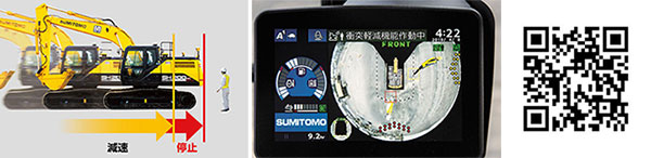 住友建機のお知らせ機能付き周囲監視装置「FVM2」に、衝突軽減システム搭載のオプション「FVM2+」が登場した。新たに追加されたのは、危険を察知した際に、機械を自動で減速・停止させる先進システムだ。重機後方270°をひと目でチェック、アラームで知らせ、さらに自動減速・停止で危険を回避する先進の予防安全システムである。
