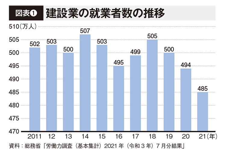 建設業では労働力不足が深刻化している。総務省が行った「労働力調査(基本集計)2021年(令和3年)7月分結果」によると、2011年~21年7月までの約10年間で、建設業の労働者は約33万人減少している(図表❶参照)。その背景には労働力の高齢化や人手不足があり、人材の確保は急務だ。