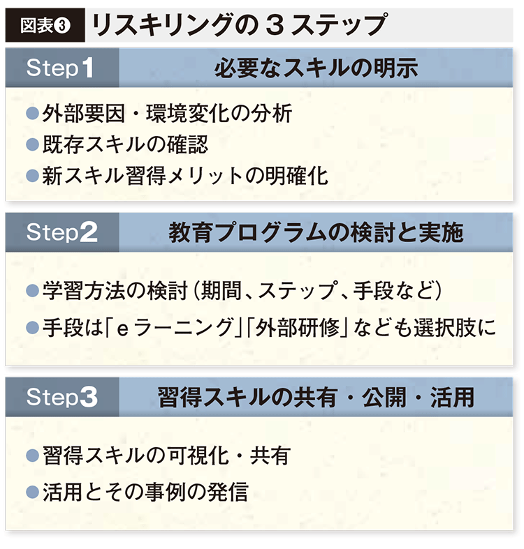 では、リスキリングはどのように進めていくものなのか。平井氏は一般的な手順として、次の3つのステップを示してくれた(図表❸参照)。