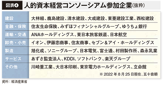 1社で実践せず、複数の企業が協力して学びの場を設ける取り組みもある。今年8月25日には、ソニーグループやキリンホールディングス、SOMPOホールディングスなどが中心となり、「人的資本経営コンソーシアム」が発足した。社員のリスキリングで連携する協議会で、参加企業は320社にものぼる(図表❹参照)。スーパーゼネコンからは、大林組、鹿島建設、清水建設、大成建設が名を連ねた。