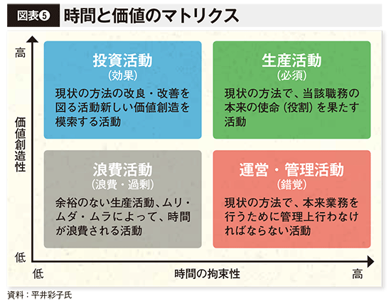 企業の活動は主に、①生産活動、②運営・管理活動、③投資活動、④浪費活動に分けられる。これを価値創造性、時間の拘束性という視点から見た場合、図表❺のようになる。