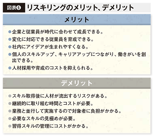 しかし、リスキリングを行わないことによる機会損失を考えれば、将来的にはそちらのコストのほうが大きくなることが予想されるともいう。いわばリスキリングは、将来必要となる人材育成や育成コストを先払いしている状態といえるだろう。ほかにも、社内にアイデアが生まれやすくなるなど、メリットは多い(図表❻参照)。