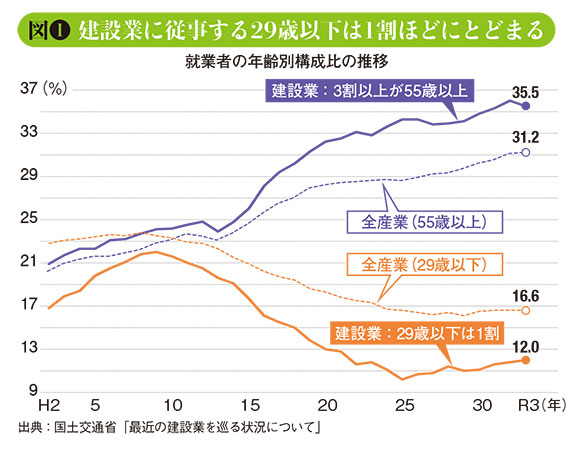 少子高齢化で若年労働力不足も深刻になっている。とくに建設業はその傾向が顕著だ。建設業に従事する29歳以下の人口は全体の約1割になっている(図❶)。将来的には建設業の担い手が激減してしまうおそれすらある。多くの企業が若手人材の獲得とその定着に力を入れているが、成果につなげるのは難しいようだ。