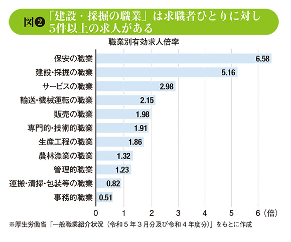 有効求人倍率でも「建設・採掘の職業」は「保安の職業」に次いで5.16倍と、飛びぬけて高い数値になっている(図❷)。