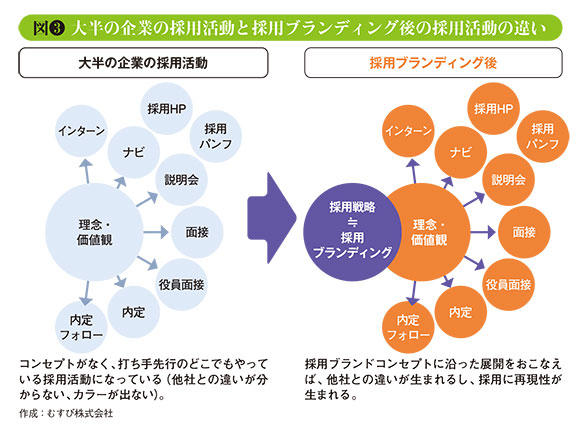 そしてそれをベースとして、求人広告やパンフレットなどさまざまな媒体で訴求していくことで一貫性が生まれ、求職者に「A社って○○な会社だよね」という印象が作られていくという。たしかにその部分がしっかりしていれば、求人広告でうたう内容と担当者の発言に齟齬はなくなる。好印象が作られるだけでなく求職者からの信頼も高まるうえ、離職率低下にもつながるだろう。まさしく「相思相愛」の採用につながるのだ。