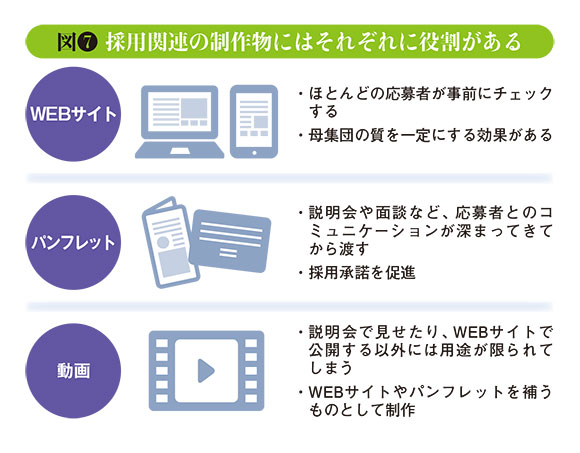 求める人材像やコンセプト、スローガンなどが固まれば、それを具体的な制作物に落とし込んでいく作業が始まる。多くの企業は求人サイトを利用したり、ウェブサイトやパンフレットなどを充実させようとする。中には動画を作る企業もある。いずれにしろ、ミスマッチを防ぐためにも自社の「らしさ」を表現したい。深澤氏によると、制作物にはそれぞれの役割があるようだ。