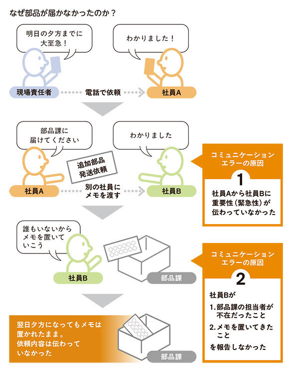 そしてもう一点、依頼の重要性(緊急性)が、メモを持参した社員には認識されていなかったことも挙げられる。「重要性が共有されていれば、直接担当者に手渡して『至急お願いします』などと口頭で念押しすることもできたでしょう。電話を受けた人も緊急性がわかっていたならば、翌朝部品課に行って確認することで防げたエラーです」