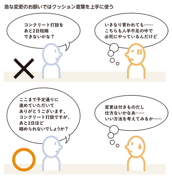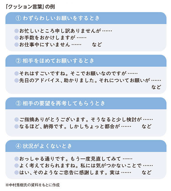 本題の前にワンクッション入れるのだ。このようなクッション言葉は「相手の感情を抑えたり、こちらの主旨を理解してもらうための潤滑油になる」と中村氏。これに関連して、次のような事例があるという。