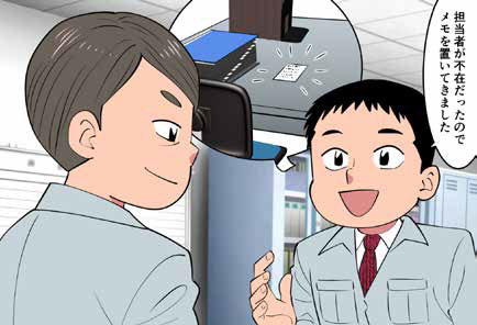 「会社で電話を受けた社員は依頼内容をメモし、それを他の社員に渡して『部品課に伝えてください』と頼んだのです。頼まれた社員は部品課に出向きましたが、担当者が不在だったため、部品課の受付デスクの箱の中にそのメモを入れただけで立ち去ってしまったのでした」