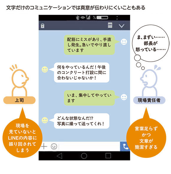 LINEなどのツールでは、文章は短く簡潔になることが多い。そのため“言葉足らず”になることもあり、人によって受け止め方が変わることもある。実際は少々の手直しで十分で、コンクリート打設工事に影響はなかったが、それを書き添えなかったためにこのようなことになったのだった。