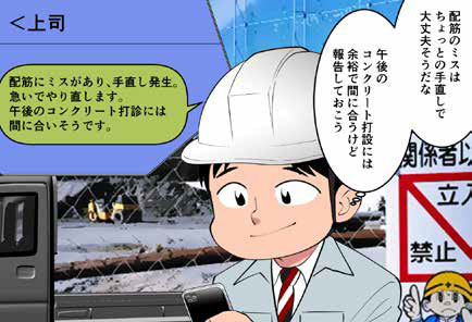 「ある現場で配筋にミスがあることがわかりました。現場の担当者はLINEで会社の上司に『配筋にミスがあり、手直し発生。急いでやり直しています』と入力して送信したのです。それを受け取った上司は『午後のコンクリート打設に間に合わないじゃないか!』と激怒し、現場が大いに慌てたということがあったのです」