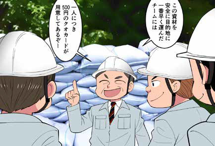 「2~3人ずつのチームをつくり、安全や効率化のためのゲームをやるのです。例えば『この資材を安全かつ効率的に目的の場所まで運ぶにはどうすればよいか』といったことを各チームに考えさせます。優勝チームのメンバーには賞品として500円分のクオカードが用意されていたりすることもありますね」